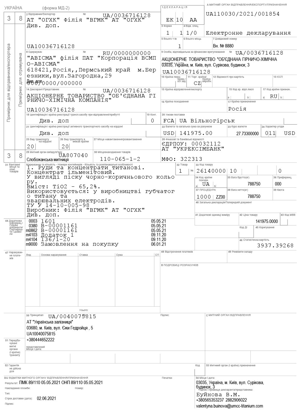 2 июня 2021 года ОГМК отправила 788,7 тонн ильменитового концентрата на общую сумму $141,98 тыс. Отправитель – филиал «ВГМК» АО «ОГХК» (документ см. ниже или по ссылке). Получатель – «АВИСМА», филиал ЧАО «Корпорация «ВСМПО-АВИСМА» (Россия, Пермский край м. Березники, ул. Загородная, 29).
