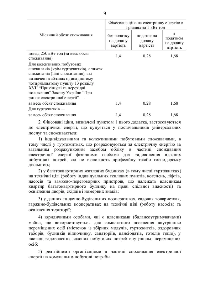 Согласно документу, тариф для потребления до 250 кВт·ч в месяц снизится на 14% до 1,44 грн за 1 кВт·ч с 1 октября. Цены останутся на уровне 1,68 гривен за 1 кВт·ч для потребления свыше 250 кВт·ч в месяц.