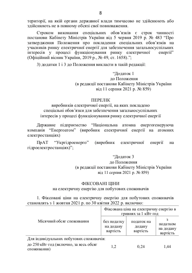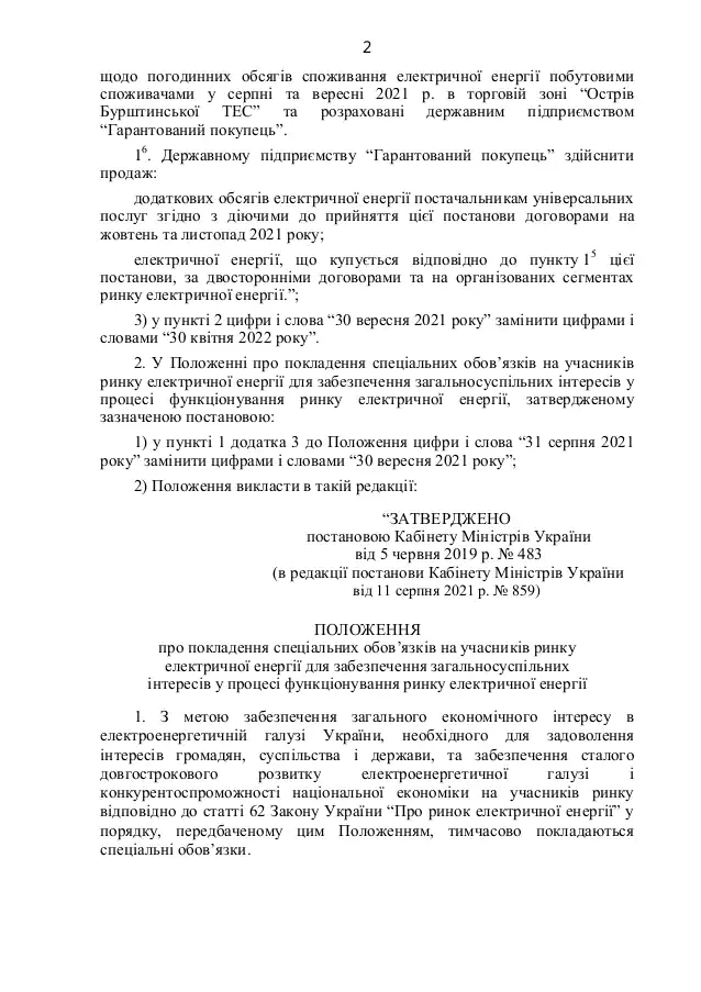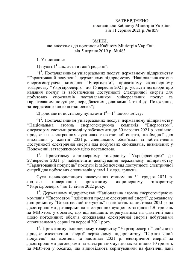 Документом поручается "Укргидроэнерго" до 27 сентября 2021 года обеспечить авансирование государственному предприятию "Гарантированный покупатель" услуги по обеспечению доступности электроэнергии для бытовых потребителей в сумме 1 млрд грн.