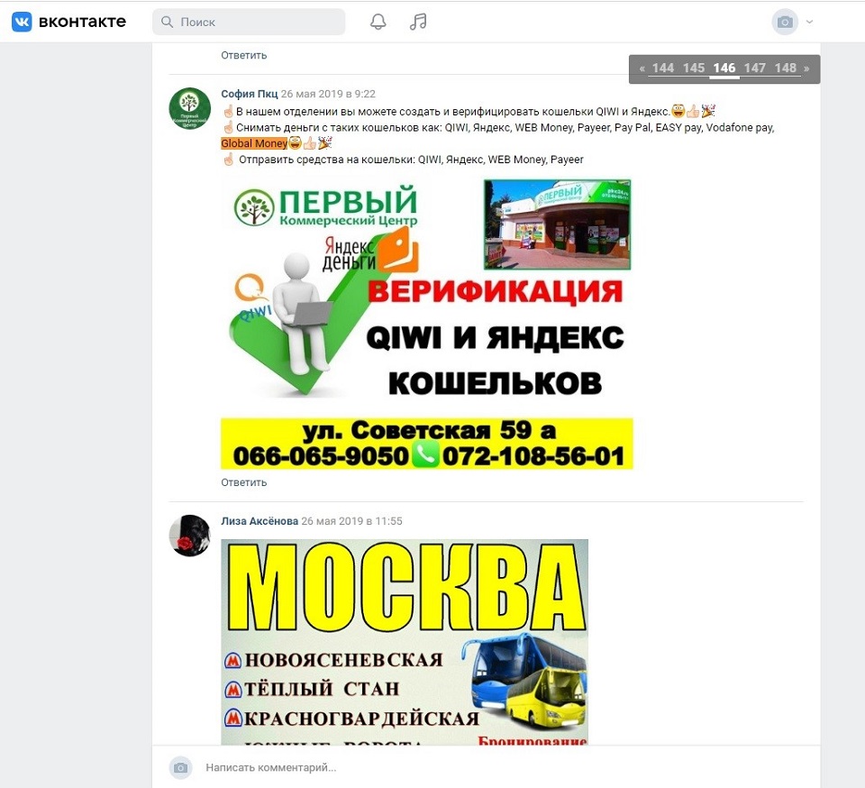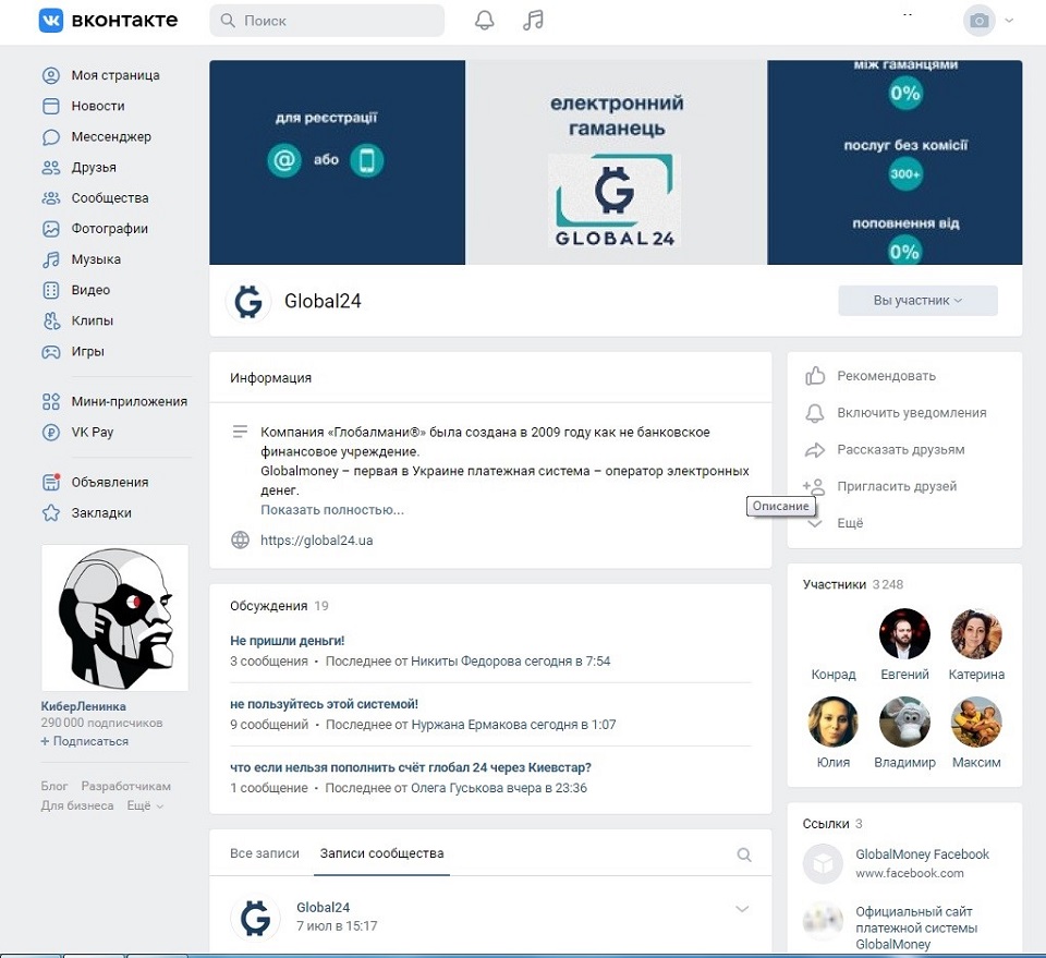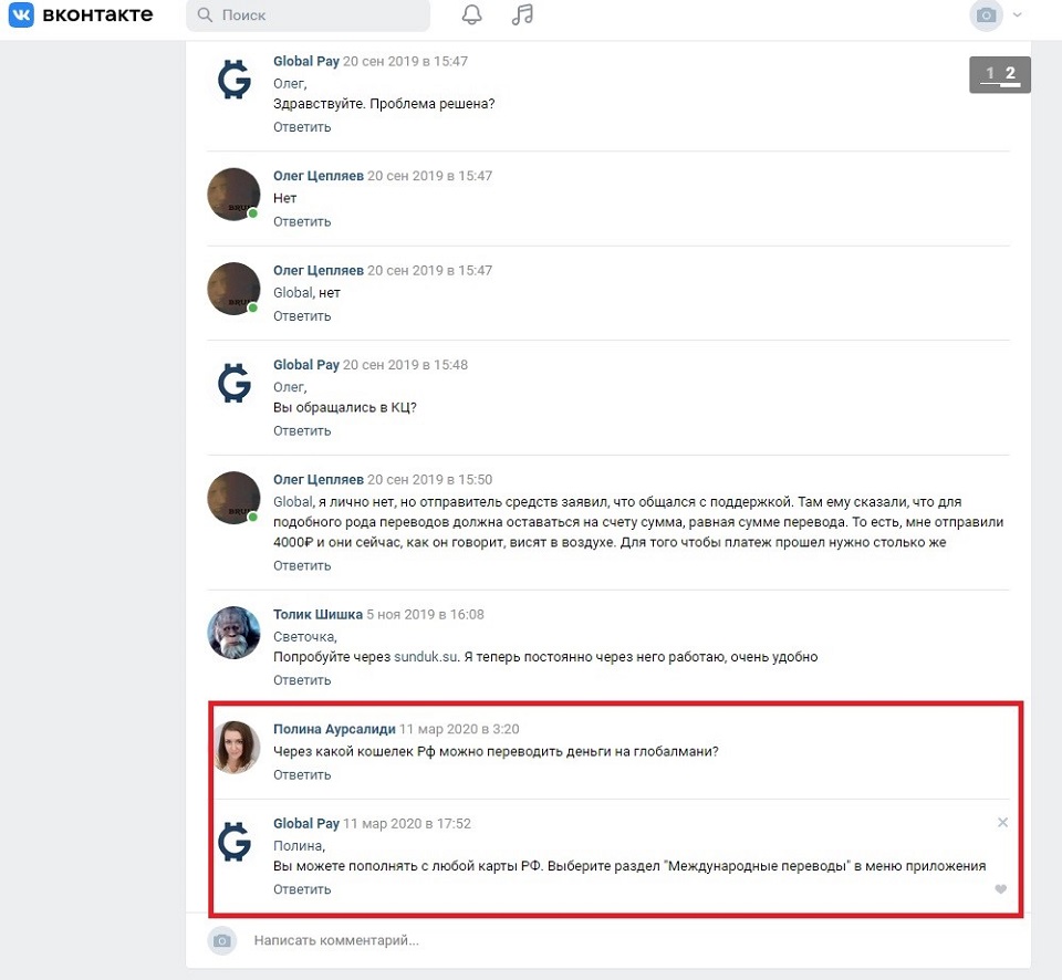 В то же время, как отмечали «Комментарии», на этой странице работала функция поддержки пользователей. В комментариях к постам на вопросы отвечал представитель Global24. В частности, он консультировал клиентов по поводу перевода средств из Украины на карточки российских банков. Также представитель ГлобалМани, отвечая на вопросы клиентов, подтверждал, что платежная система работает с «любым банком» на территории РФ.