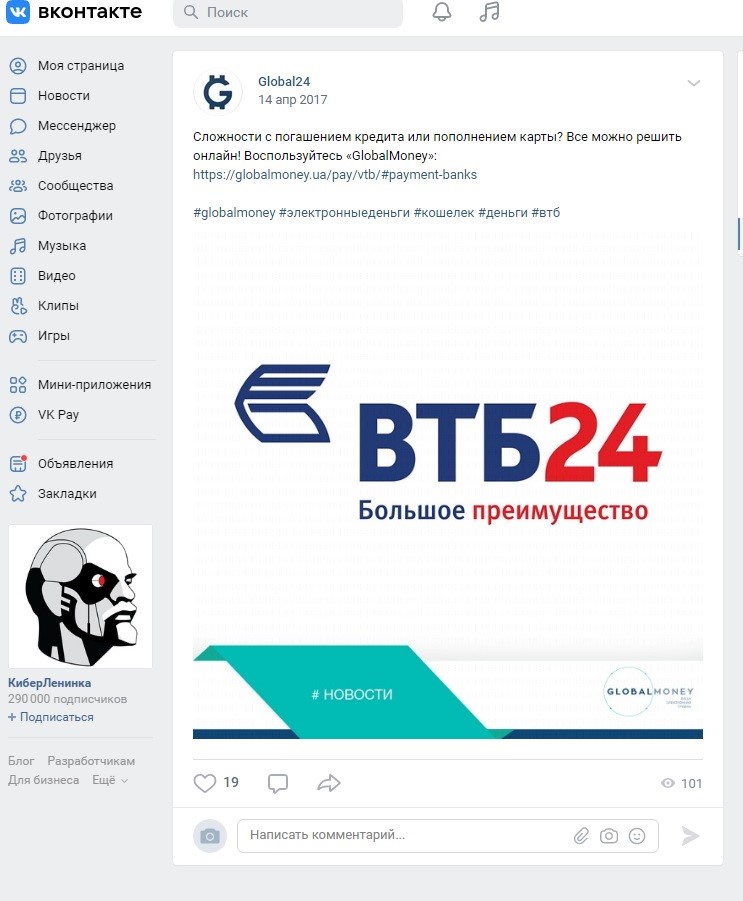 Кроме того, на странице Global24 в «Вконтакте» есть реклама совместного проекта Globalmoney и российского государственного банка ВТБ «ВТБ24. Большое преимущество». Реклама датирована 17 апреля 2017, то есть уже после введения санкций СНБО против российских банков в марте 2017 года.