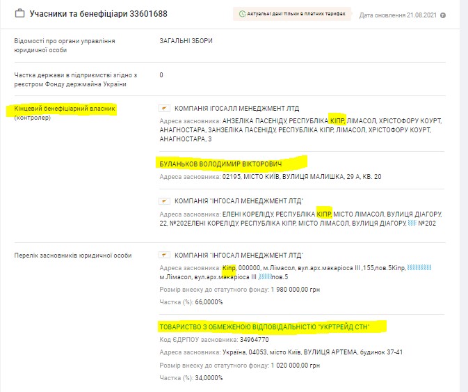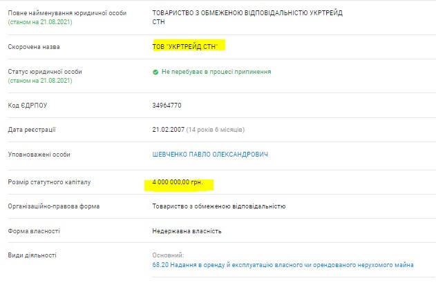 Среди основателей этой компании есть ООО «Укртрейд СТН» - еще одна компания, где Владимир является владельцем, основателем и опять же бенефициаром. Компания зарегистрирована в 2007-м году по адресу: остров Водников, д.1. Руководитель - Шевченко П.А. Уставной капитал – 4 миллиона.