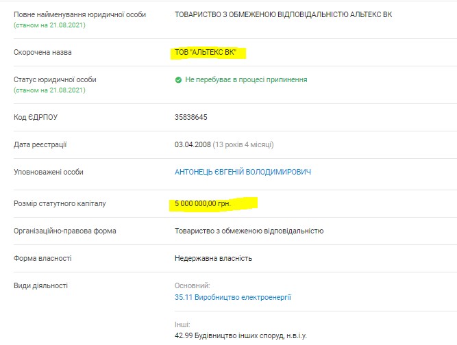 Компания ООО "АЛЬТЕКС ВК" зарегистрирована в 2008-м году по юридическому адресу: Киев, остров Водников, д. 1. Руководителем является Антонец Е.В. Размер уставного капитала составляет 5 миллионов гривен. Бенефициар – сам Владимир Буланьков.