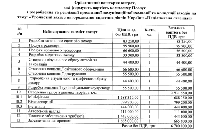 Режисер заходу отримає 99,9 тис грн, музикальний продюсер – 66,6 тис грн. Розробка сценарію урочистості обійшлась у 83 тис грн. Весь кошторис нижче.