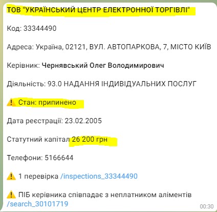 - ТОВ "УКРАЇНСЬКИЙ ЦЕНТР ЕЛЕКТРОННОЇ ТОРГІВЛІ" –статусный фонд 26 200 гривен, статус – ликвидировано.