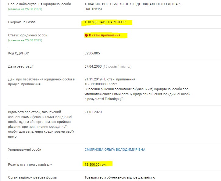 - ТОВ "ДЕШАРТ ПАРТНЕРЗ" – статусный капитал 18 500 гривен, находится в статусе прекращения деятельности с 2019-го года.