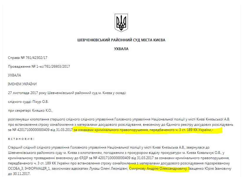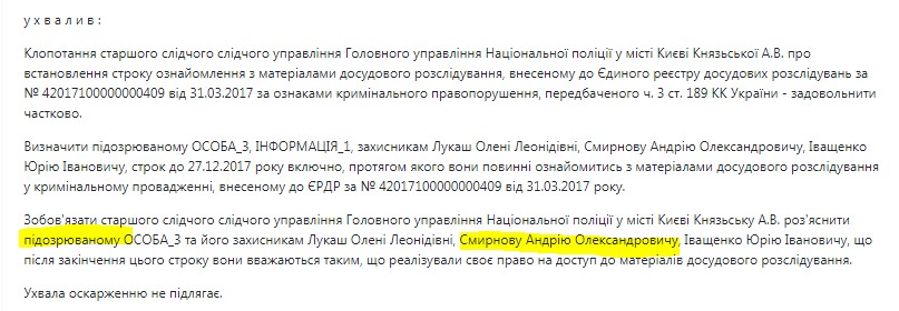 Так, в документах речь идет о том, что замглавы Офиса президента Смирнов является соучастником побега Чауса, бывшего руководителя Днепровского районного суда столицы, из страны.