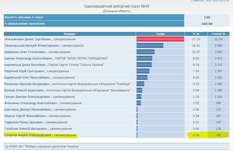 Первая попытка Смирнова пробиться Верховную Раду в 2014-м году окончилась полным провалом. Тогда он был кандидатом в нардепы по 49 округу в Донецкой области, как самовыдвиженец и беспартийный. Кстати, тогда Андрей Смирнов занял позорное последнее место с результатом 0,38% (145 голосов).