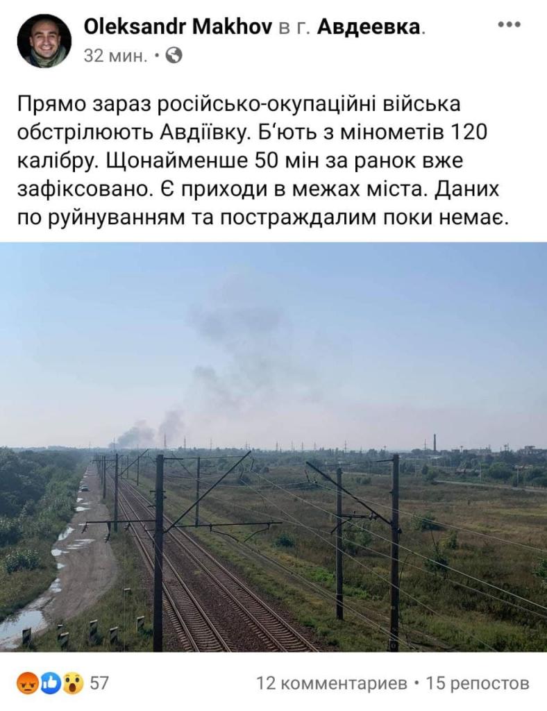 Люди сообщают о двух утренних обстрелах Авдеевки, говорят о «прилетах» около 50 мин за утро. Официальных данных о разушениях и пострадавших пока нет.