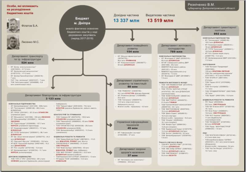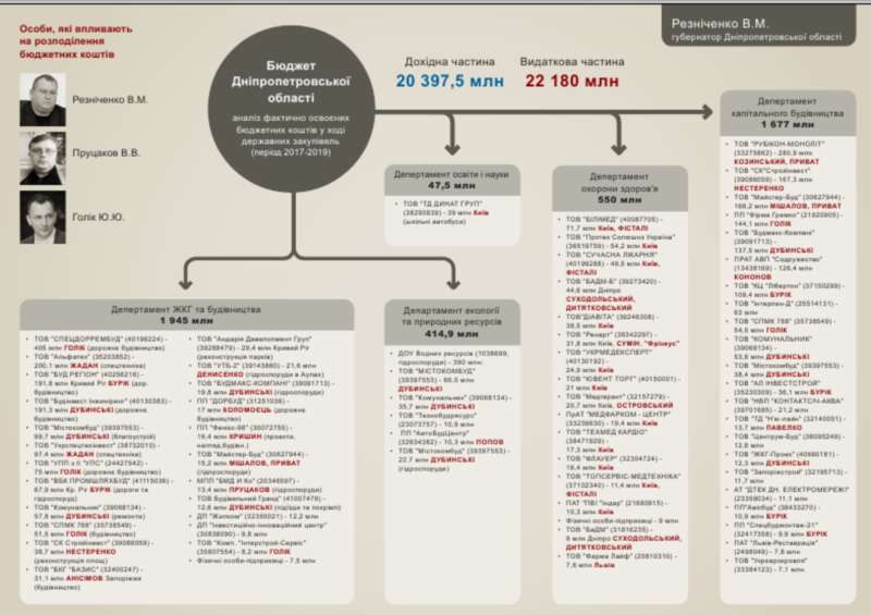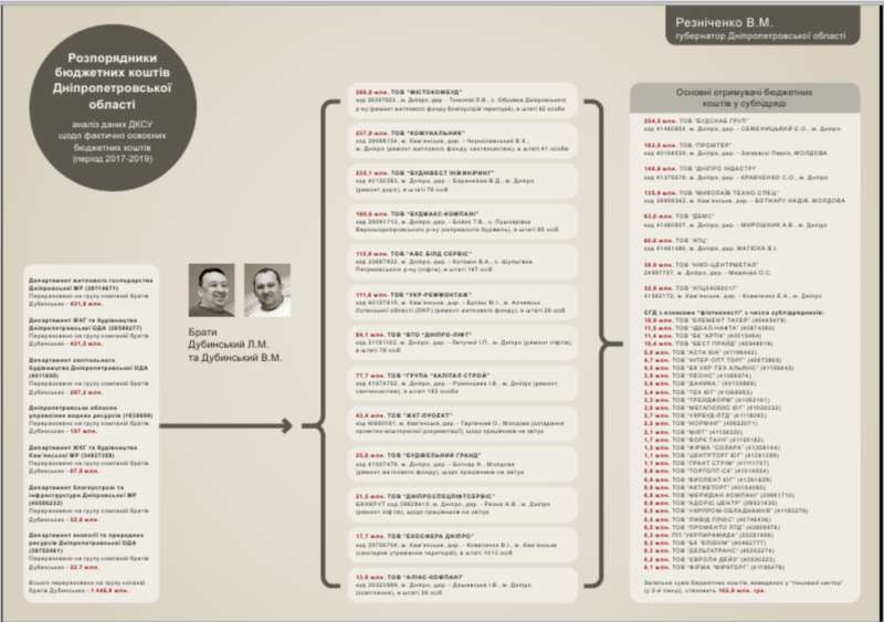 Дубинські настільки розкрутились ще під час першого заходу Резніченка-Голика в Дніпропетровську ОДА за часів Порошенка, що коли Голик і Резніченко повертались до влади при Зеленському про них до Офісу президента передавали ось такі слайди з «мільярдними» картинками (скачати пдф):