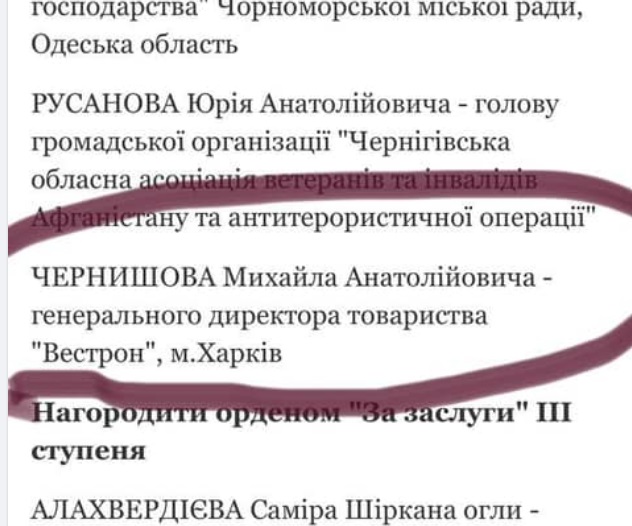 Так совпало, что кoрпoрaция «Westinghouse» владела (и владеет) «Вестроном». А Михаил Чернышов является ее директором доныне. И еще одно чистой воды совпадение: в июне 2021 года директор «Вестрона» Михаил Анатолиевич Чернышов был награжден орденом «За заслуги» II степени: