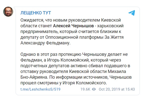 Бывший народный депутат Сергей Лещенко прямо заявил, что назначение произошло после прохождения Чернышовым собеседования у Коломойского: