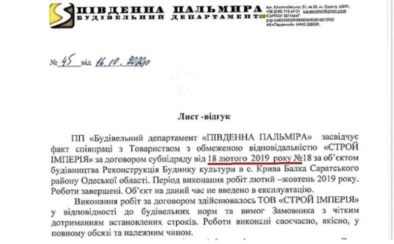 В управлении капитального строительства заранее определились с победителем и даже не обратили внимания на неточности, которые допустила Тельпис при формировании пакета документов. Она предоставила тендерной комиссии письмо о подтверждении сотрудничества ЧП «Строительный департамент «Южная Пальмира» со «Строй Империей» при реконструкции дома культуры в селе Кривая Балка Саратского района, согласно договору подряда от 18 февраля 2019 года. Стоит отметить, что «Строй Империя» была зарегистрирована 26 февраля того же года, на восемь дней позже, чем сама дата договора. Очередной факт мошенничества.