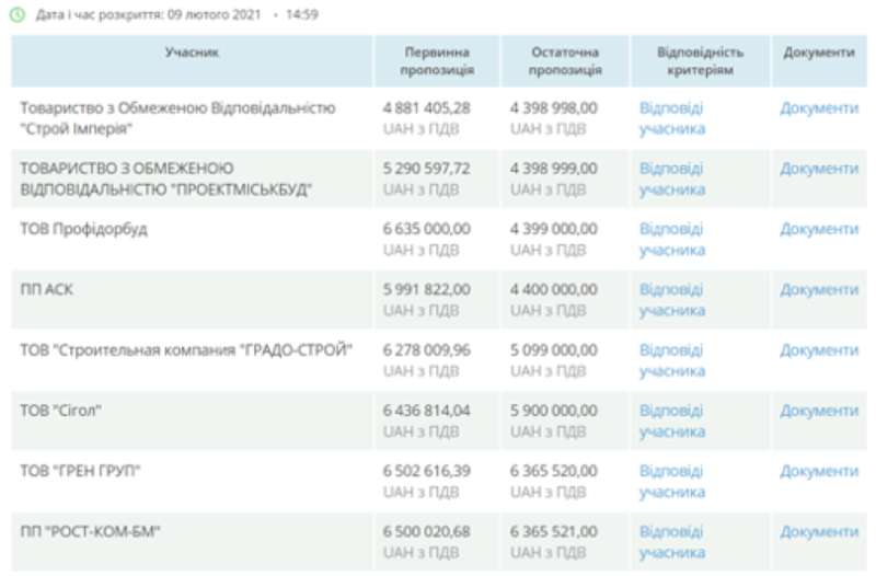 Успешным было участие «Строй Империи» в тендере на строительство амбулатории в Захарьевке. Тельпис указала стоимость в предложение на 721 тыс. грн. меньше, чем двух других участников.