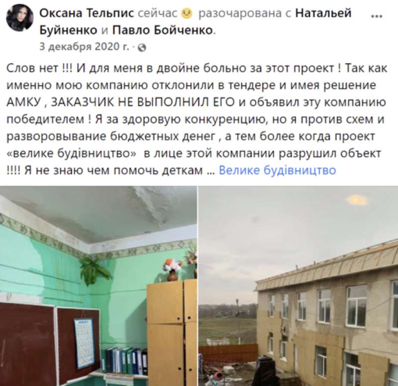 Иногда фортуна отворачивалась от Тельпис. В июле 2020 года «Строительная группа «Стоунбудинвест» победила в тендере на капремонт школы в селе Шевченково. Управлению капитального строительства пришлось заключить с данной фирмой контракт на сумму 11 983 804,92 грн. на основании решения Антимонопольного комитета Украины. В таких случаях Тельпис поливает грязью своих конкурентов и обвиняет в коррупции.