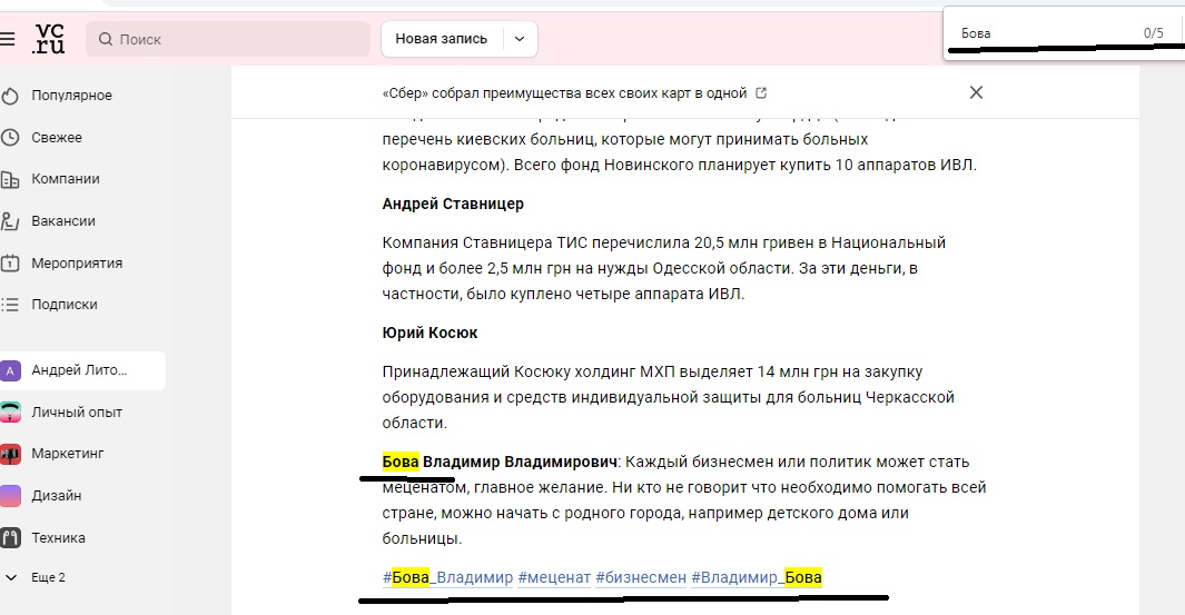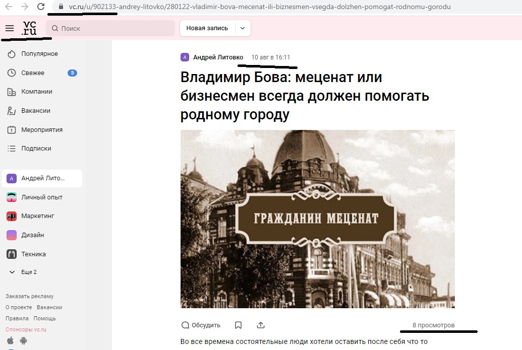 Чомусь матеріал розміщений на російському ресурсі, до того ж, за цілий місяць має аж 8 переглядів. І як мінімум один із цих переглядів – справа рук автора цього матеріалу. До того ж згадується Володимир Бова у цій статті п’ять разів: один раз – у заголовку, двічі – у тегах. І ще двічі дається його пряма мова, в якій він абстрактно розмірковує про меценатство. Про те, що такого меценатського зробив сам Володимир Бова, у статті ні слова. Як і про те, яке місто він вважає рідним і допомагає йому. Натомість згадуються інші відомі в Україні бізнесмени та меценати. І щодо них вже вказуються їхні конкретні дії: