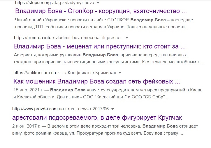 Але, як там не було, іншої інформації про «меценатство» чи спонсорство, чи іншу благодійність Володимира Бови більше немає. Зате є цілий шквал інформації про його не зовсім, скажімо м’яко, законні дії: