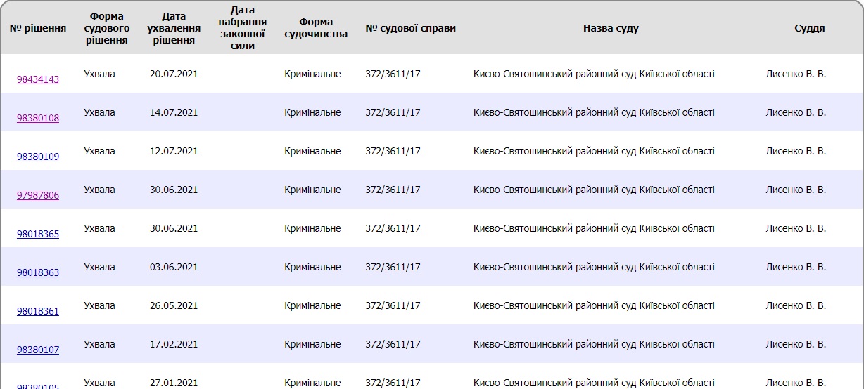 Вивчаючи реєстр, можна подумати, що справа перебуває в активній фазі, але не треба обманюватися – останні рішення, які ви бачите на фото вище, це вердикти суду щодо оплати перекладачів (один із фігурантів – громадянин РФ) і ті самі рішення щодо повернення заставних сум. Тож перспектива трохи зрозуміла.