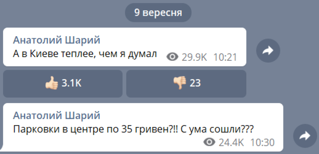 Утром 9 сентября на Telegram-канале Анатолия Шария появилось сообщение: "А в Киеве теплее, чем я думал".