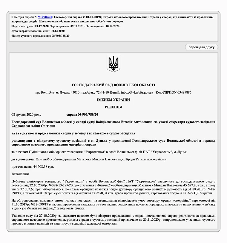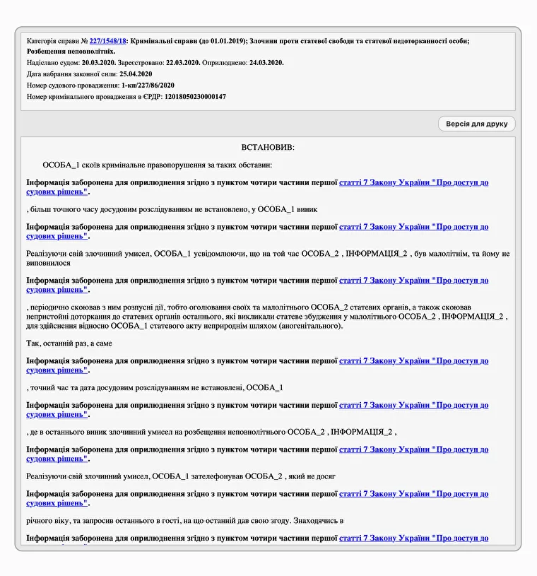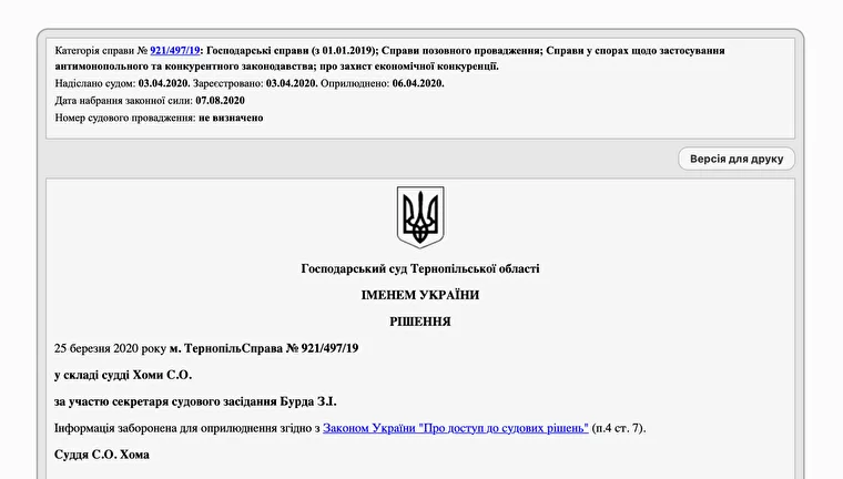 На перший погляд, рішення повні, однак їхній текст чомусь завершується фразою «Інформація заборонена для оприлюднення згідно з Законом України «Про доступ до судових рішень» (п. 4 ст. 7).». В деяких з них ця фраза приховує ПІБ судді у справі (хоча воно й лишається у вступній частині рішення (приклад 1), а в інших – ні (приклад 2). Враховуючи те, що такі рішення прийняті винятково господарськими та адмінсудами першої та апеляційної інстанцій, вищезазначена фраза може з’являтися у текстах через «Діловодство спеціалізованого суду», якою всі ті суди користуються.