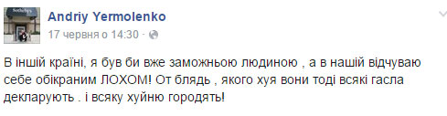 "В іншій країні, я був би вже заможною людиною, а в нашій відчуваю себе обікраним ЛОХОМ!", - написав тоді ж таки Єрмоленко.