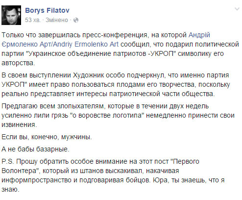 "Пропоную всім злостивцям, які протягом двох тижнів посилено лили бруд "про крадіжки логотипу" негайно принести свої вибачення", - написав на своїй сторінці у Facebook нардеп Борис Філатов.