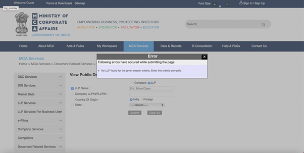 Результаты поиска партнерства S.K. Mine-Chem на официальном сайте Министерства корпоративных дел Индии