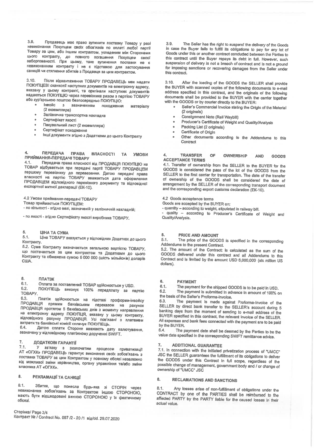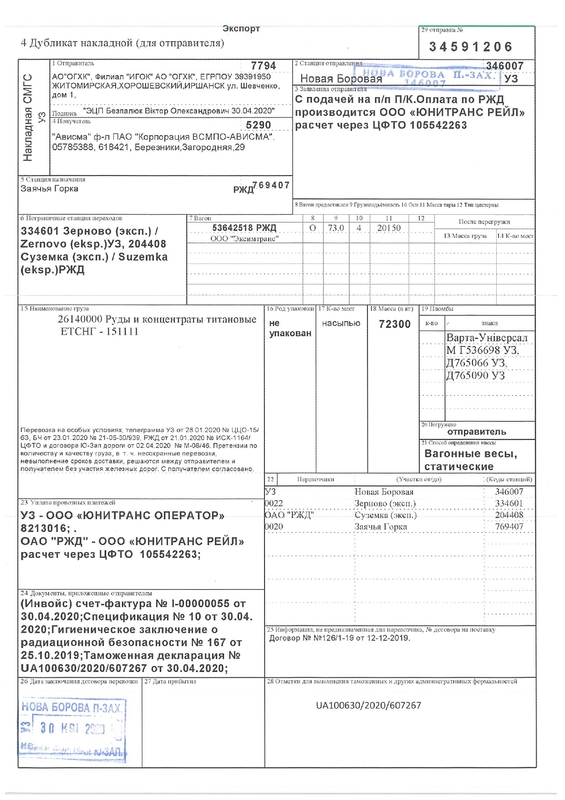 В частности, 30 апреля 2020 года ОГХК отгрузила 72,3 тонны ильменитового концентрата (насыпью) через филиал «Иршанский ГОК» в Россию по адресу АО «ВСМПО-АВИСМА» со станции «Нова Борова» на станцию «Заячья Горка».