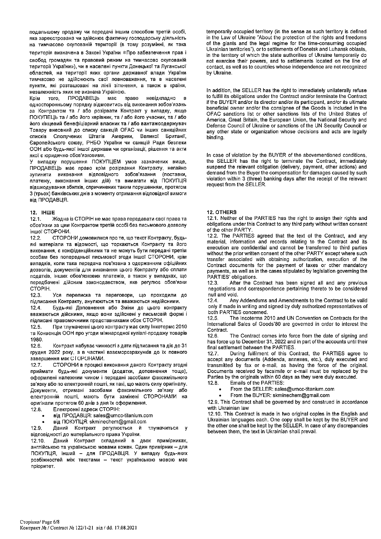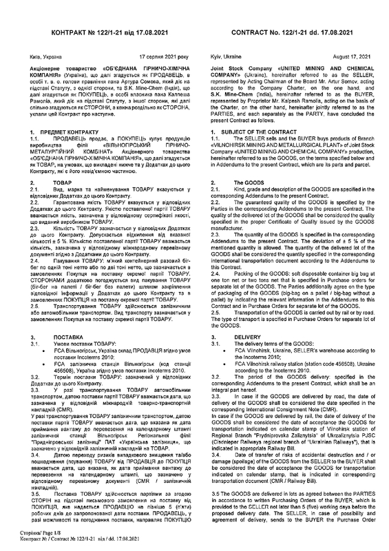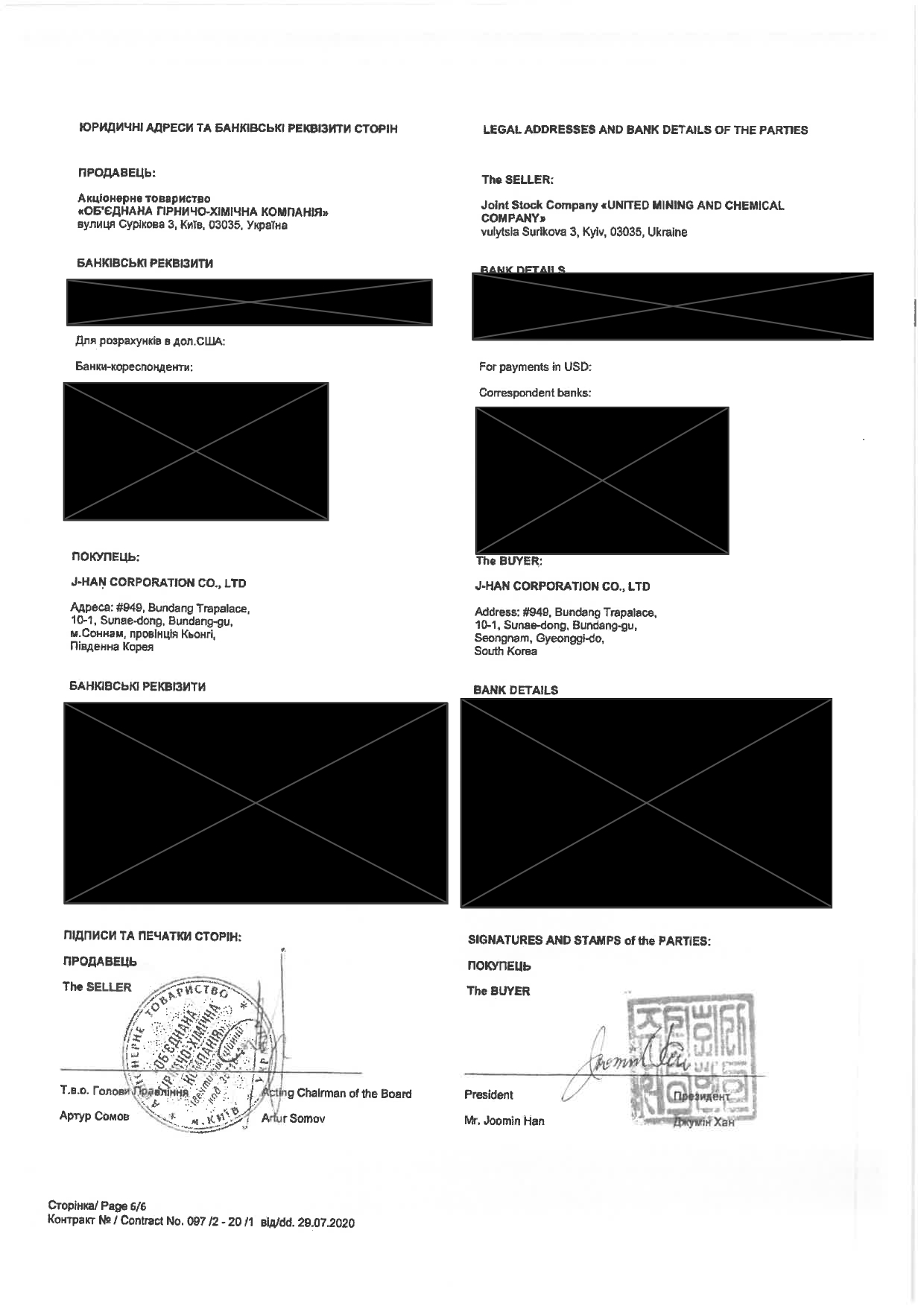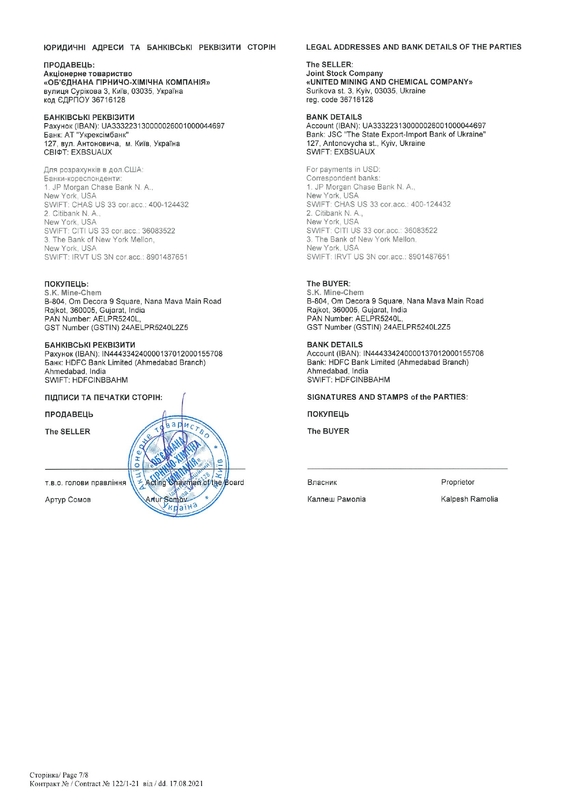 17 августа 2021 все тот же и.о. главы правления ОГХК Артур Сомов подписал Контракт № 122/1-21 от 17.08.2021 с фиктивной (!!!) компанией S.K. Mine-Chem на сумму 12 млн. дол. и сразу заключил спецификацию на сумму 3 млн. 192 тыс. дол. для поставки продукции на сумму свыше 3 млн. дол. уже в августе-сентябре 2021 г.