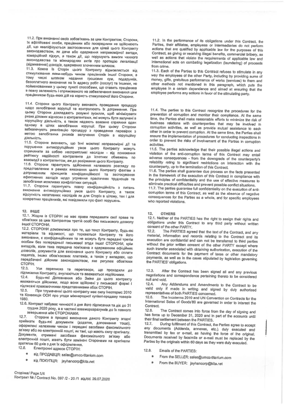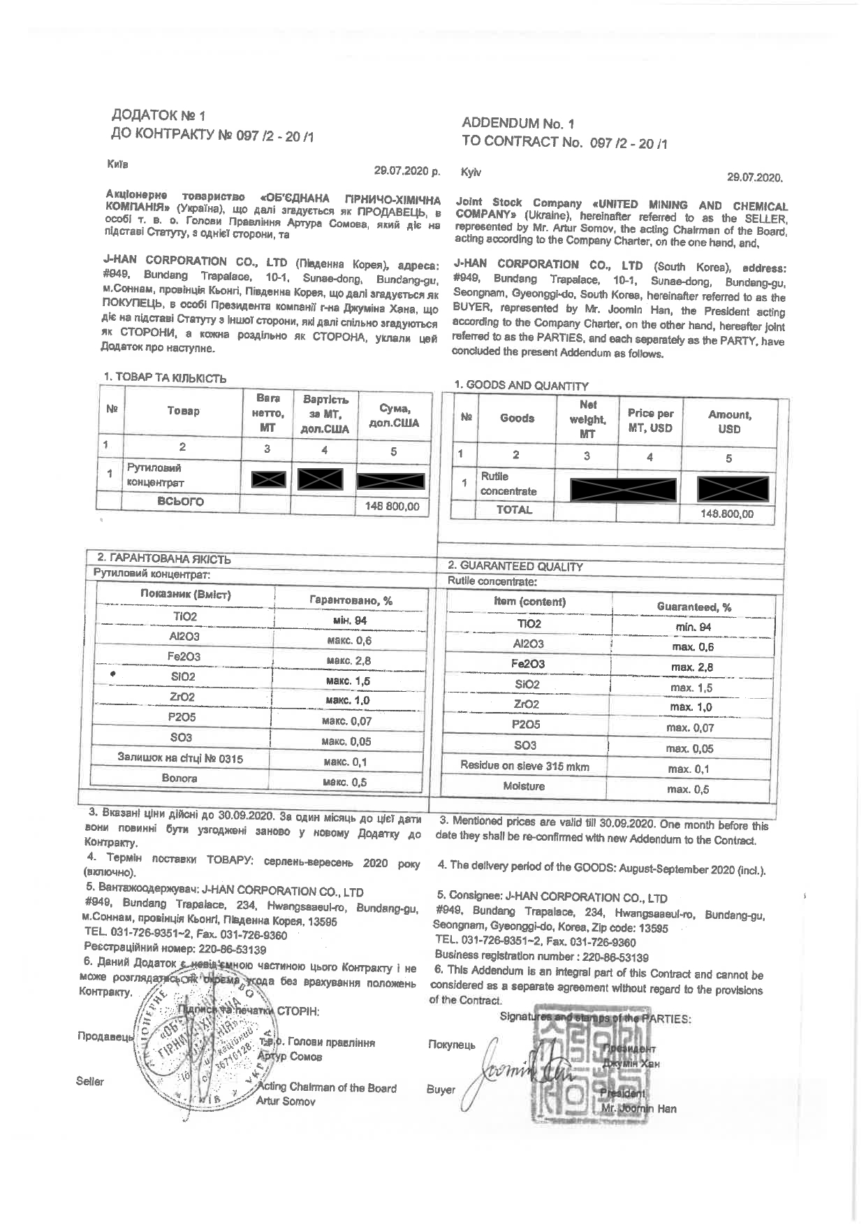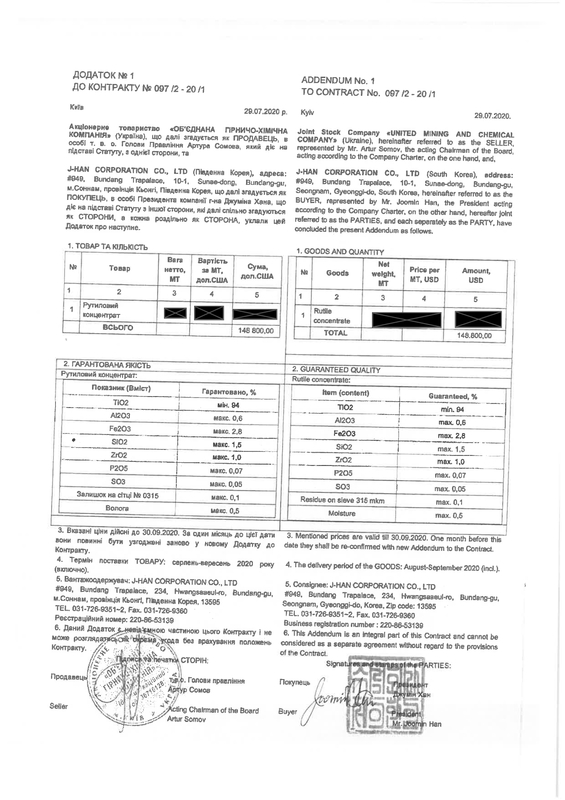 Совершенно непонятно, как при таком количестве регуляторных методик и усиленных фильтров, не говоря уже о повышенной бдительности Сомова лично, могло случиться, что в июне сего года ОГХК был подписан контракт на поставку рутилового концентрата с компанией JHan Corp Ltd, которая уже два десятка лет открыто (!!!) работает со структурами Д.Фирташа?! Бывший и.о. главы правления ОГХК А.Сомов не просто лично подписал этот контракт, но и лоббировал его пролонгацию до конца нынешнего года. В тексте контракта с JHan Corp Ltd нет даже намеков хотя бы на формальный запрет поставок санкционным и недружественным потребителям.