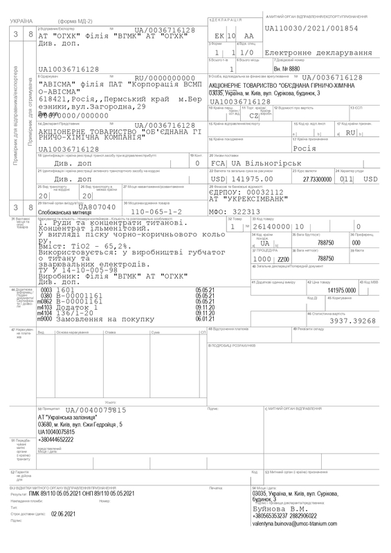 «Заслуги» Сомова перед ОГХК и Украиной будут не полными если не вспомнить и другую сенсационную информацию, которая не так давно была опубликована изданием «Hubs» Согласно грузовым таможенным декларациям и накладным, филиалы ОГХК осуществляли поставки продукции "ВСМПО-АВИСМА" в апреле 2020 года, а также в мае и июне 2021 года.