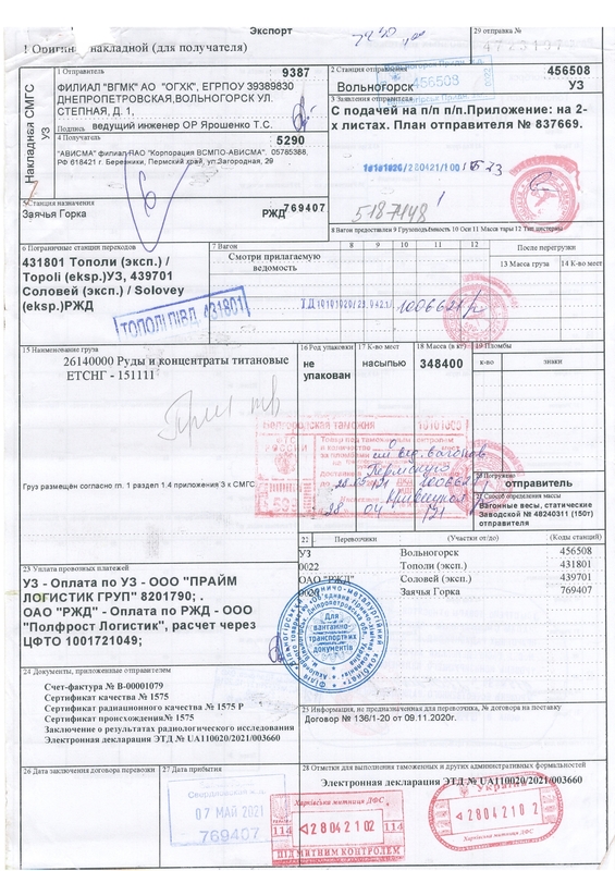 7 мая 2021 года ОГХК отгрузила 348,4 тонны руды и титанового концентрата «Вольногорского ГМК» на станцию «Заячья Горка». Отправителем указан филиал «ВГМК» «ОГХК» согласно контракту № 136/1-20 от 09.11.2020 г. Формальным покупателем груза по этому контракту является чешская компания BELANTO trade s.r.o (акционерами компании являются граждане Украины).