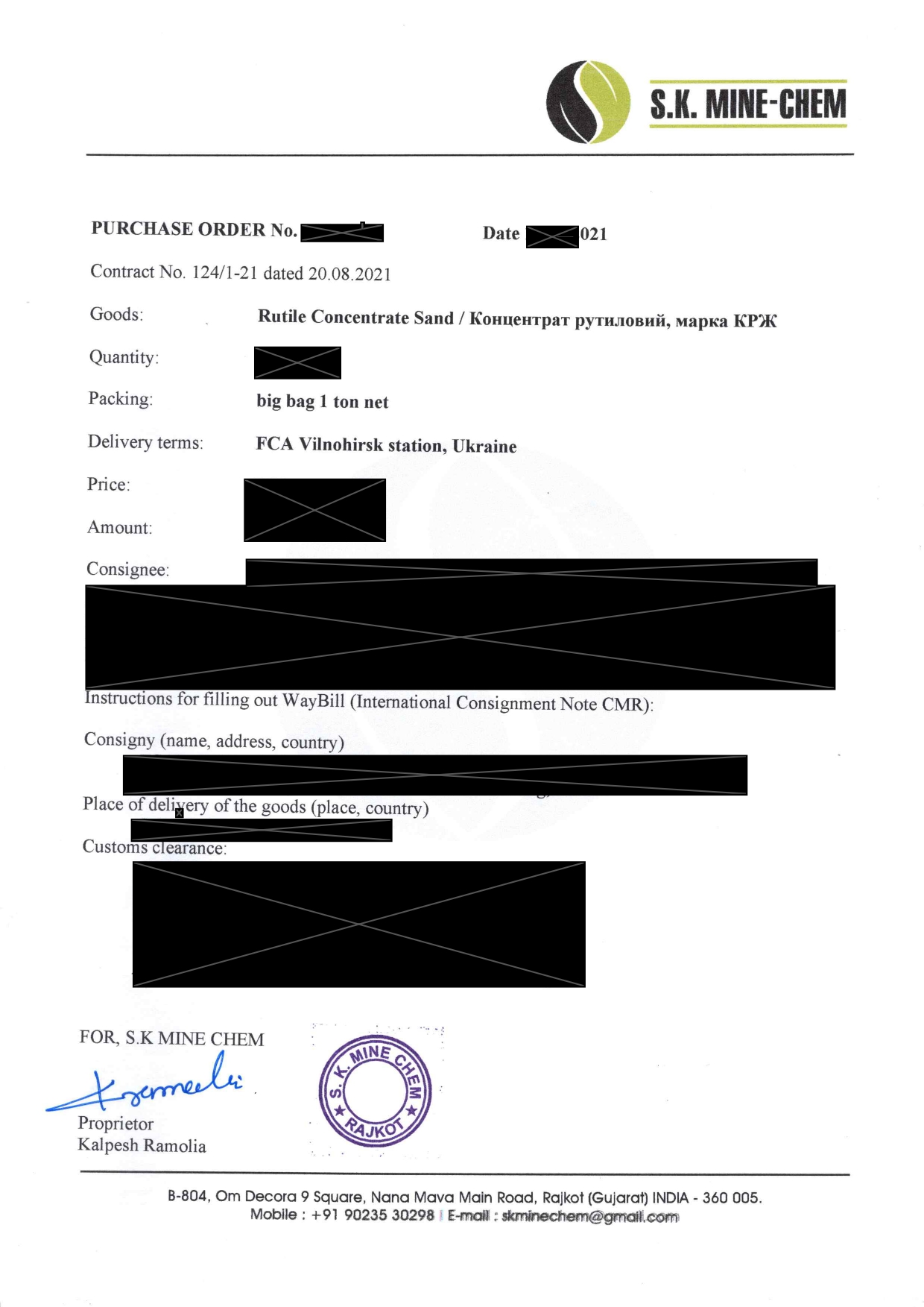Согласно имеющейся информации, индийский предприниматель KALPESH RAMOLIA он же компания S.K. Mine-Chem осуществили контракт с ОГХК в интересах эмиратской оффшорной компании Defessa Trans F.Z.E. И эта информация также легко проверяется из открытых источников. В 2021 году согласно публичным данным Defessa Trans F.Z.E. приобрела у S.K. Mine-Chem три поставки рутилового концентрата, а непонятно откуда взявшаяся S.K. Mine-Chem был единственным поставщиком сырья для Defessa Trans F.Z.E. Примечательно, что за 4 дня до заключения контракта с KALPESH RAMOLIA/S.K. Mine-Chem потребителям продукции Defessa Trans F.Z.E. официально было сообщено о том, что продукцию в 3-4 кварталах 2021 г. будет поставлять новый трейдер. Не правда ли, поразительная информированность иностранцев о планах украинской госкомпании и ее конфиденциальной коммерческой информации?!
