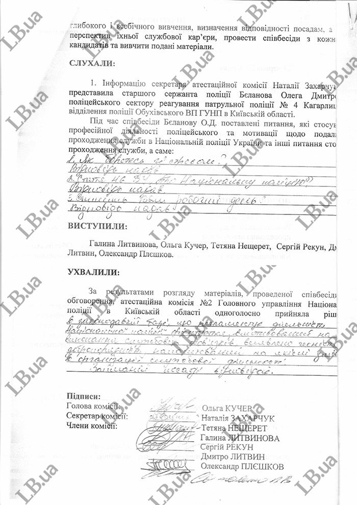Після тестування поліціянти мали змогу презентувати себе на співбесідах. Членкиня атестаційної комісії Тетяна Нещерет переконує: ті співробітники, які набрали невисоку кількість балів, змогли реабілітуватися на цьому етапі. Та чи дійсно члени комісії отримали вичерпну інформацію, яка могла б компенсувати низькі оцінки декотрих поліціянтів? З атестаційних листів, які має редакція, випливає, що на співбесідах йшлося про загальні, а не про конкретні речі. Деякі діалоги мали такий вигляд: