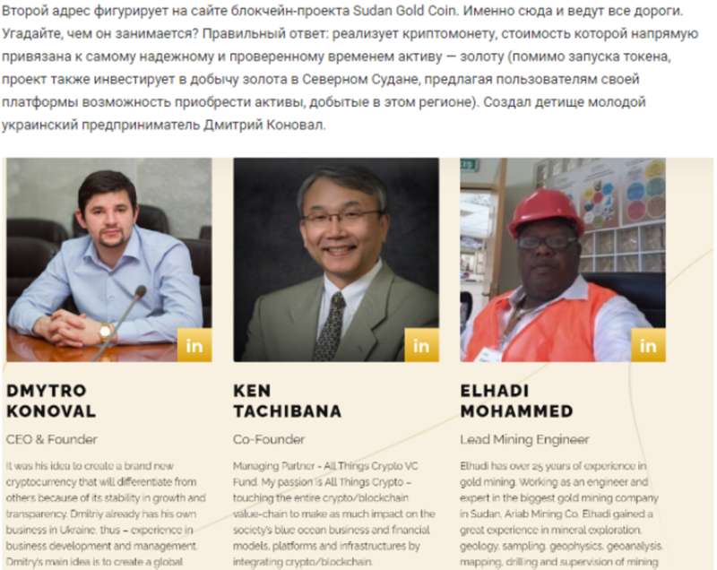 Понимая, что лёгкой наживы в данных сферах деятельности им больше не следует ожидать, они обратили внимание на бурно развивающуюся на то время сферу: криптовалюту. Создали криптовалютный проект Sudan Gold Coin и закрепили за ним Дмитрия Коновала, как медийное лицо, якобы с чистой, неиспорченной репутацией для договорных встреч с будущим наивным инвестором.
