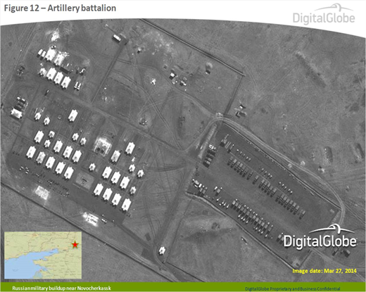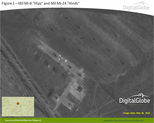 Штаб верховного главнокомандующего Объединенными вооруженными силами НАТО в Европе опубликовал в четверг пакет спутниковых снимков, на которых изображено местоположение и тип российской военной техники вдоль границы с Украиной. Снимки датированы 22, 26 и 27 марта 2014 года.