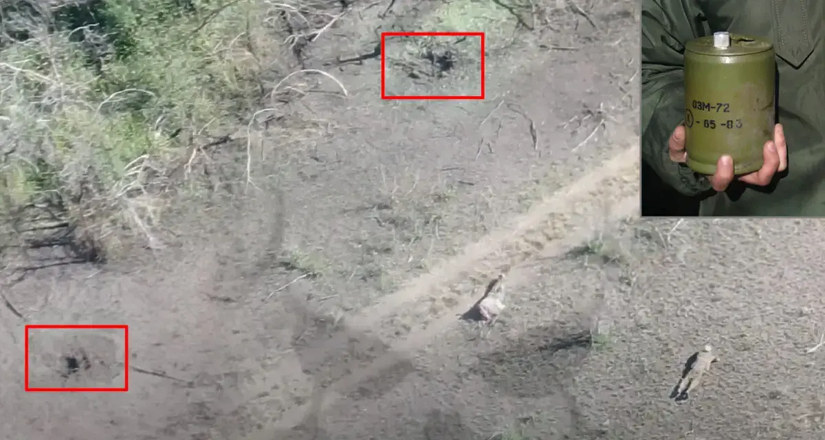 На видео зафиксированы подрывы взрывных устройств, установленных заранее. Беспилотник сначала снял два взрыва и тела боевиков, а позже — третий взрыв и подрыв саперов оккупационных сил РФ.