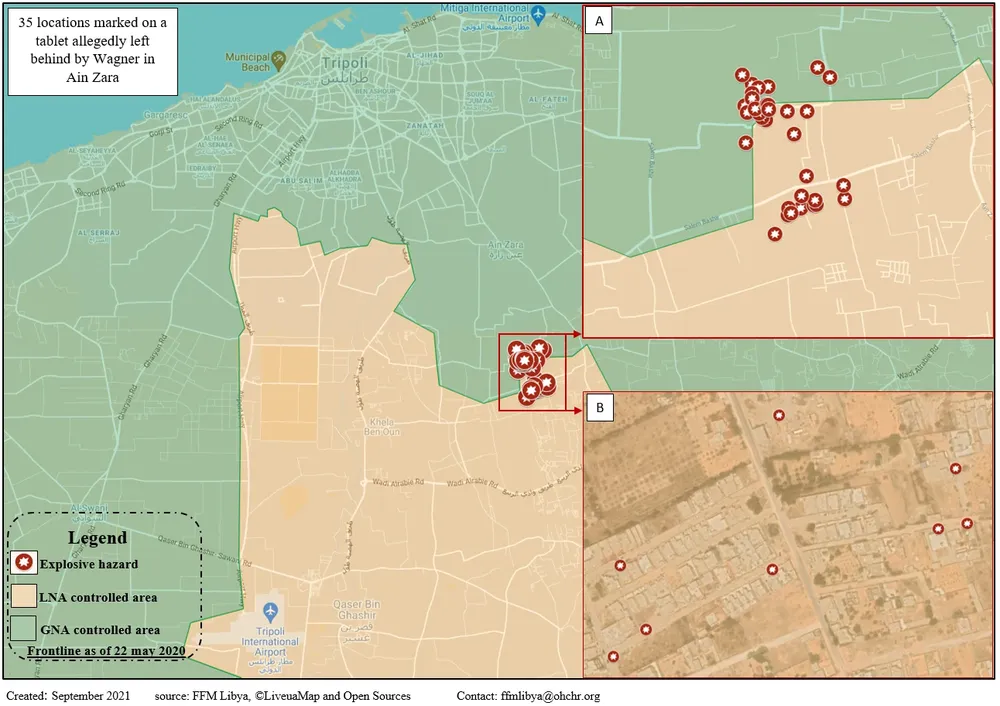 В сентябре 2019 года лица, связанные с российской «ЧВК Вагнер» и присутствовавшие в Ливии в качестве наемников в поддержку Ливийской национальной армии, возглавляемой генералом Халифой Хафтаром, к югу от Триполи убили мирных людей, не участвовавших в боевых действиях. «Собранные миссией доказательства подтвердили, что сотрудники «Вагнера» стреляли непосредственно в жертв после их захвата и задержания», отмечается в докладе. И далее вывод: «есть все разумные основания» полагать, что они могли совершить военное преступление — убийство гражданских лиц.