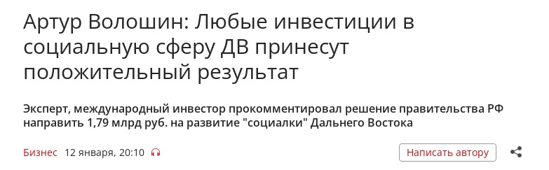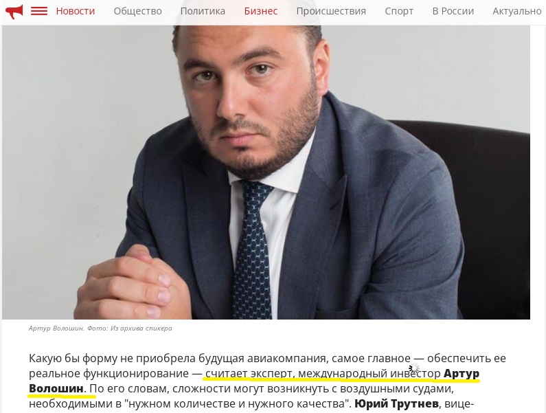 Причем комментирует в качестве «эксперта и инвестора» Волошин все, что только можно представить – создание на Дальнем Востоке авиакомпании-лоукостера, перспективы развития туризма в регионе, судьбу «праворуких машин», инвестиции в социальную сферу: