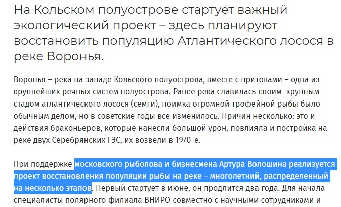 Добрался даже до Кольского полуострова и экологии – якобы за его деньги и по его же инициативе «На Кольском полуострове стартует важный экологический проект – здесь планируют восстановить популяцию Атлантического лосося в реке Воронья». Правда, в данном случае Волошин почему-то представляет себя в качестве «московского рыболова и бизнесмена»: