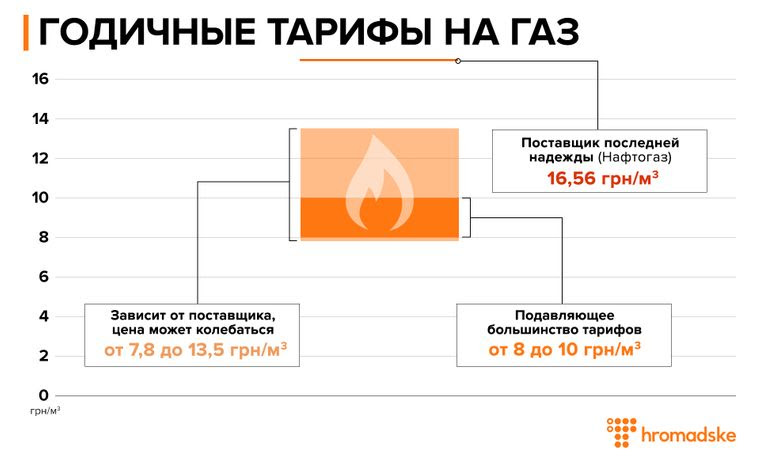 И напоследок: если у вашего поставщика внезапно закончится газ или возникнут еще какие-то проблемы — вас «аварийно» переключат на «Нафтогаз»: поставщика последней надежды. В этом случае компания будет продавать вам газ уже вдвое дороже — за 16,56 грн, хотя ее обычный тариф составляет 7,9 грн.