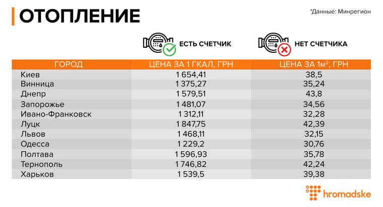 На расчеты влияет еще и наличие счетчиков. Если они есть, то, например, в Киеве за 1 Гкал надо будет оплатить 1654,41 грн; в Одессе — 1229,2 грн; в Харькове — 1539,5 грн. Если же счетчиков нет, то действуют нормативы на квадратный метр жилья: в Киеве это — 38,5 грн, в Одессе — 30,76, в Харькове — 39,38.
