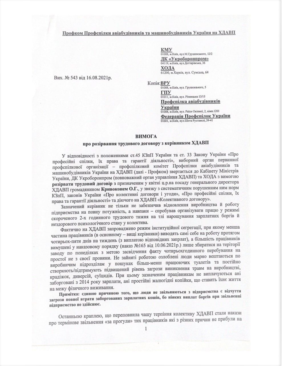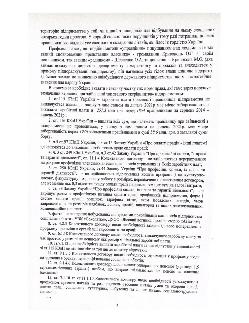 Профком завода, в связи с грубыми массовыми нарушениями трудового и профсоюзного законодательства, законодательства о коллективных договорах (ст. 115, ст. 116, ч.5. ст.97, ч.3. ст. 249, ст. 250, ст. 38 КЗоТ, нарушения пунктов 4.2.5, 6.1.18, 7.1.12, 9.1.3.5, 9.1.4.6, 7.1.10 и 11.1.10), выдвинул требования к ГК “Укроборонпрому” о разорвании контракта с Кривоконем.