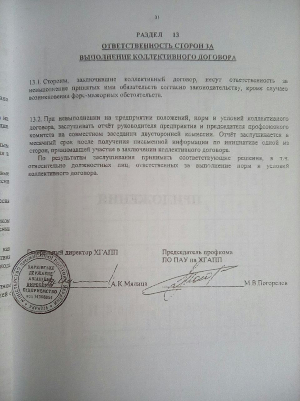Кроме того, Кривиконь пытался организовать трудовой коллектив в свою защиту. Для этих целей около 60 работников (чуть более 3% работников) предприятия написали письмо в его защиту якобы “от имени трудового коллектива”. Однако, действующее законодательство четко регулирует, кто именно может представлять интересы трудовых коллективов. Это должен быть исключительно репрезентативный орган. И таким на данный момент является профком профсоюза работников авиастроения и машиностроения на ХГАПП (ХАЗе), который возглавляет М.Погорелов.