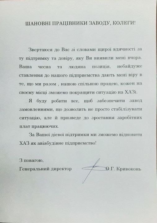 Второй приход Кривоконя на ХАЗ (первый был в январе – августе 2017 г.) с самого начала сопровождался скандалом. Во-первых, его назначали непрозрачно, без какого-либо конкурса, по личной протекции главы “Укроборонпрома” Юрия Гусева, который даже об этом не посоветовался со своими замами. Мнение трудового коллектива, который наделен правом принимать участие в управлении предприятием согласно норм ст. 65 Хозяйственного Кодекса Украины, никто в учет не принимал. А зачем? Мы же в Европу идем на словах, а не на самом деле.