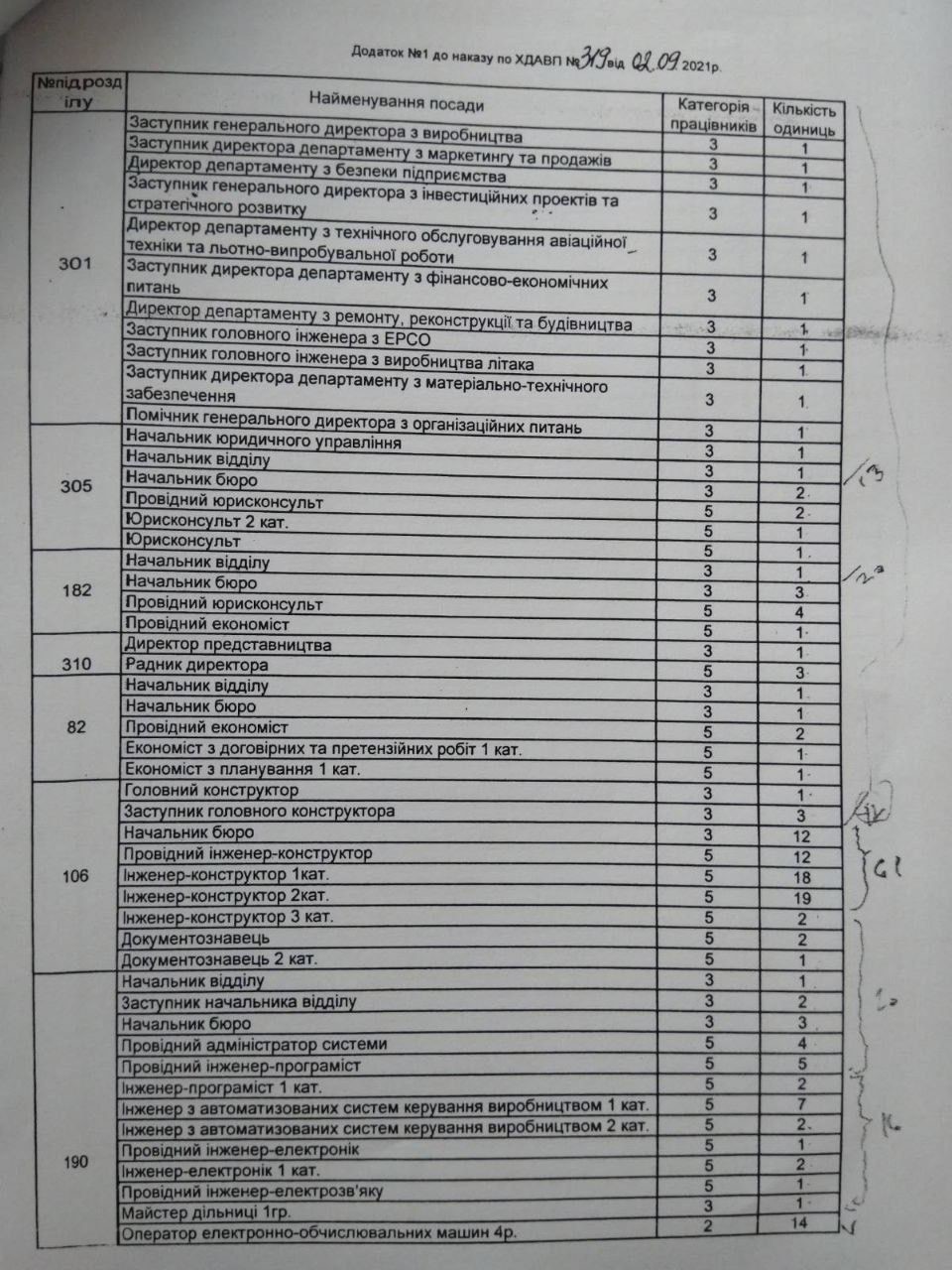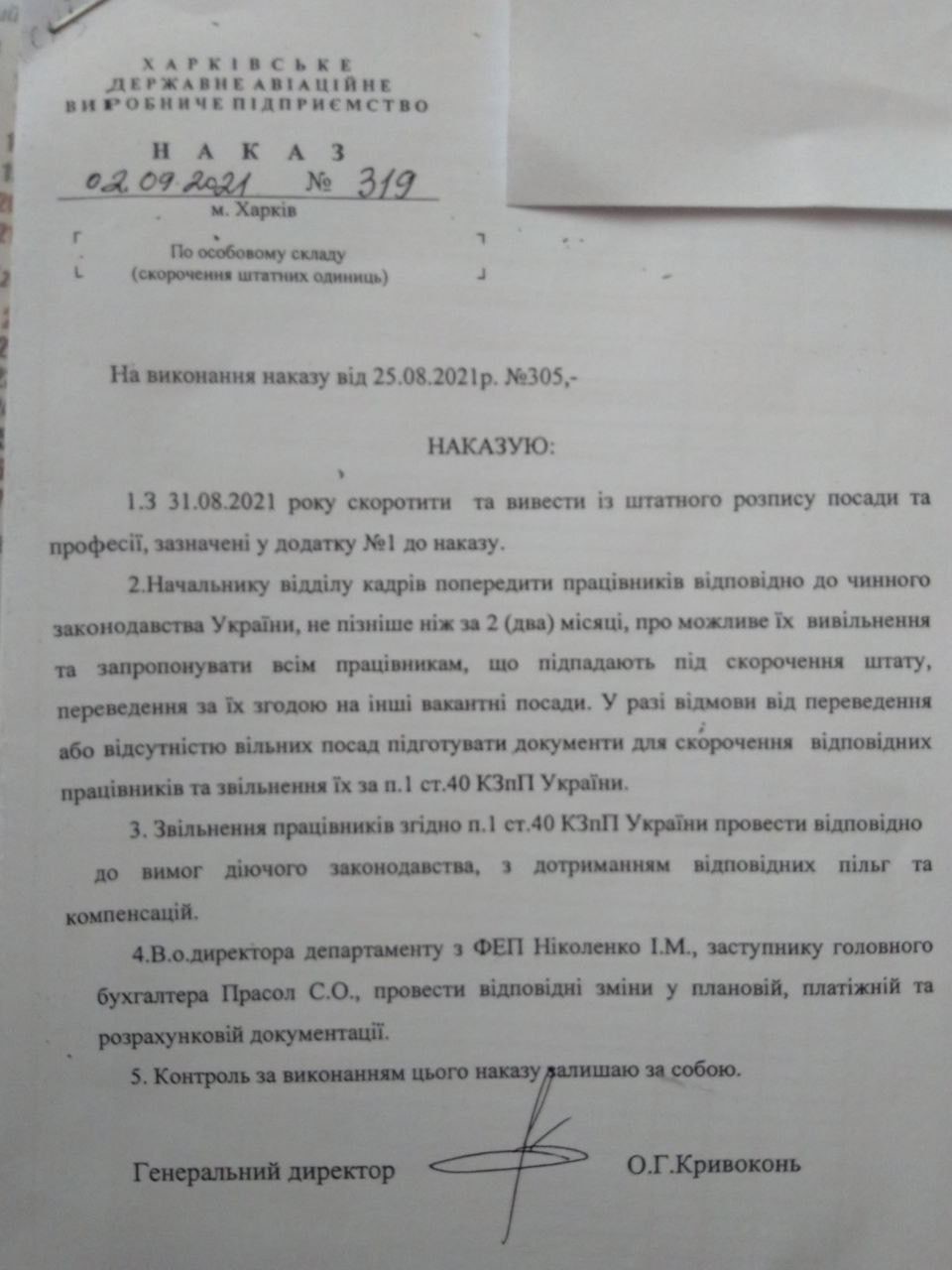 Приказом №319 от 02.09.2021 Кривоконь инициирует сокращение большого количества работников – около 100, это почти 6% от общей численности. Согласно Отраслевому Соглашению авиационной промышленности, которое, кстати, подписал и “Укроборонпром”, если сокращается более 4% от численности работников предприятия, такое сокращение надлежит согласовать с ЦК Профсоюза, а не только с профкомом предприятия. Стоит ли говорить, что ни того, ни другого сделано не было. Но кого же в основном коснулись эти сокращения? В основном, это сокращение служб конструкторов и снабженцев. Да, именно тех, от кого зависит взлет АНов с территории ХАЗа.