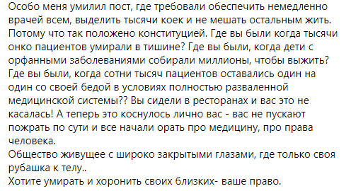 «Особо меня умилил пост, где требовали обеспечить немедленно врачей всем, выделить тысячи коек и не мешать остальным жить. Потому что так положено по Конституции. Где вы были, когда тысячи онкопациентов умирали в тишине? Где вы были, когда дети с орфанными заболеваниями собирали миллионы, чтобы выжить? Где вы были, когда сотни тысяч пациентов оставались один на один со своей бедой в условиях полностью разваленной медицинской системы?