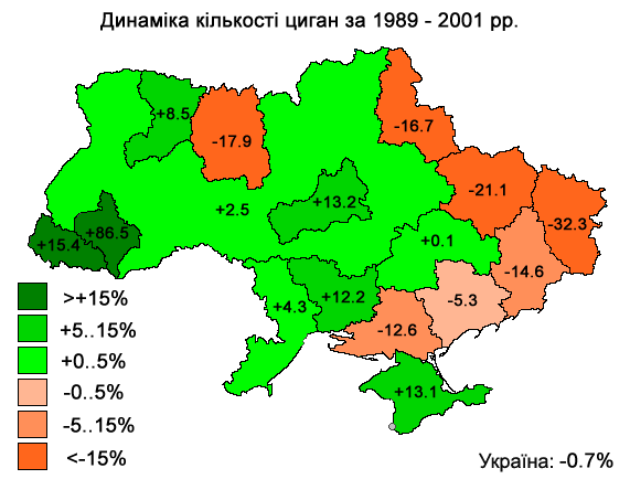 Резко в относительном измерении (но не в абсолютном) выросло количество цыган в Ивано-Франковской области; скорее, это мигранты из Закарпатья. Неожиданным является и достаточно высокий прирост цыганского населения в Черкасской области.