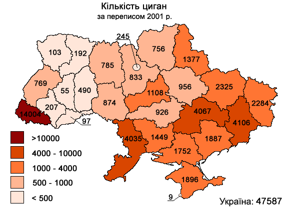 В 2001 г. В Украине насчитывалось 47 587 цыган.