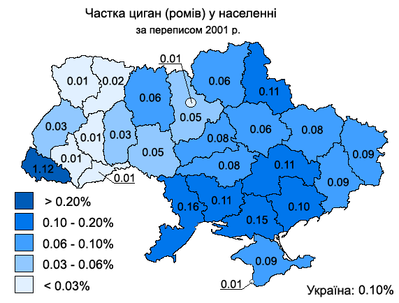 В общем, только в 7 регионах из 27 доля цыган превышала среднеукраинский уровень.